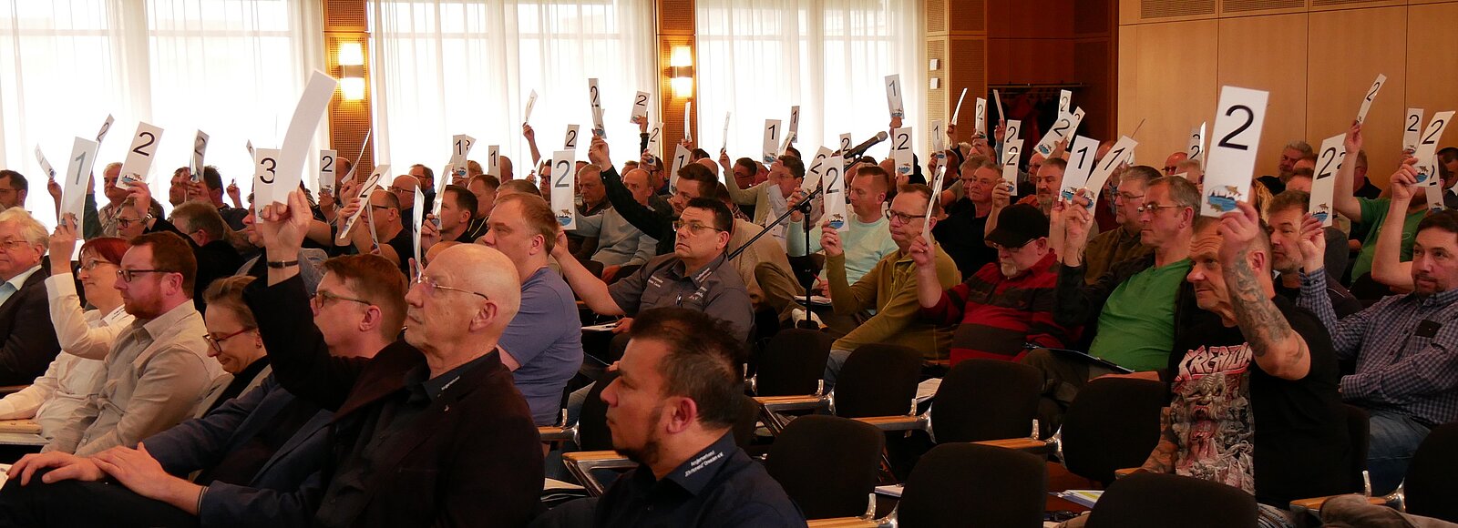 Die Beschlussfassungen über die Entlastung des Präsidiums und die Haushaltsabrechnung 2025 erfolgten einstimmig. Der Beschluss über den vorgelegten Haushaltsplan 2026 erfolgten mit deutlicher Mehrheit  mit 226 Ja-Stimmen, 2 Gegenstimmen und 2 Stimmenenthaltungen. Auch die Delegierten des AVE, welche uns in der Landesverbandsdelegiertenversammlung vertreten, erfolgte einstimmig. Grundlegender Beschluss und von allen vorher mit Spannung erwartet war der Beschluss über die geplante Beitragserhöhung für die kommende Jahre.